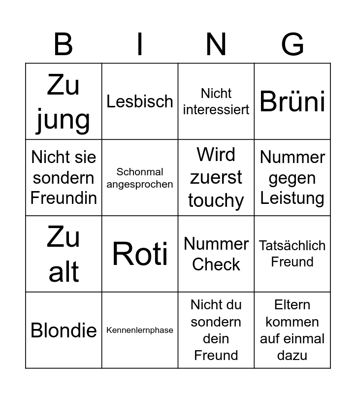 This bingo card has 16 words: Kennenlernphase, Tatsächlich Freund, Nicht interessiert, Zu jung, Zu alt, Lesbisch, Nummer Check, Nicht du sondern dein Freund, Nicht sie sondern Freundin, Schonmal angesprochen, Blondie, Brüni, Roti, Nummer gegen Leistung, Wird zuerst touchy and Eltern kommen auf einmal dazu.