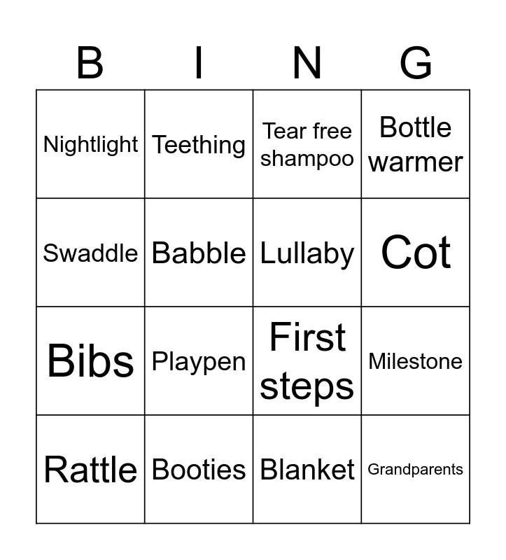 This bingo card has 64 words: Dummy, Pram, Nappy rash, Sleepless nights, Bottle, Baby grow, Teething, Burping, Cot, Cute, Midwife, Water birth, Blanket, Swaddle, Formula, Babble, Milestone, Nightlight, Mobile, Bibs, Nursing Pillow, Grandparents, Bottle warmer, Baby podwer, Monitor, Tummy time, Growth chart, Car seat, High chair, Peekaboo, Gurgle, Hospital bag, Teddy, Changing mat, Playpen, Soothe, First words, Crawling, Nursery, Lullaby, First steps, Booties, Wipes, Feeding, Nap time, Rattle, Coo, Toddler, Hospital toast, Due date, Ultrasound, Growth Spurt, Bottle sterilizer, Nursing bra, Bouncer, Baby group, Tear free shampoo, Nail clippers, Teething ring, Safety gate, Finger foods, Roll over, Storytime and Finger puppets.