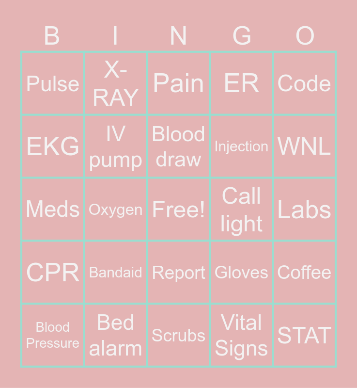 This bingo card has a free space and 29 words: Pen, Bed alarm, Pain, Charting, Code, Pulse, IV pump, Blood draw, Call light, Coffee, Blood Pressure, Oxygen, Vital Signs, STAT, Meds, Fever, Scrubs, Gloves, WNL, CPR, Bandaid, Wound care, Injection, Labs, EKG, X-RAY, Report, ER and ICU.