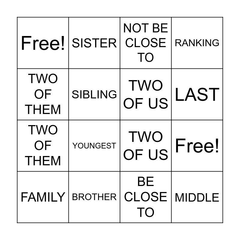 This bingo card has 20 words: FAMILY, BROTHER, NOT BE CLOSE TO, Free!, OLDEST, SIBLING, INTERESTING, RANKING, TWO OF THEM, SISTER, BE CLOSE TO, LAST, Free!, YOUNGEST, TWO OF US, MIDDLE, TWO OF THEM, TWO OF US, Free! and Free!.