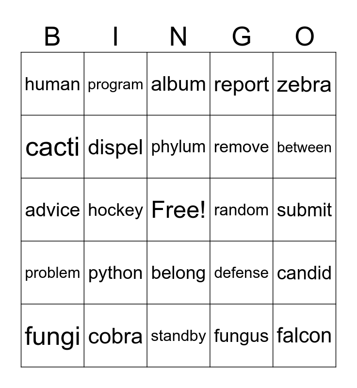 This bingo card has a free space and 24 words: python, cobra, phylum, fungi, zebra, human, cacti, program, random, belong, remove, advice, defense, candid, dispel, fungus, submit, album, between, hockey, falcon, problem, report and standby.