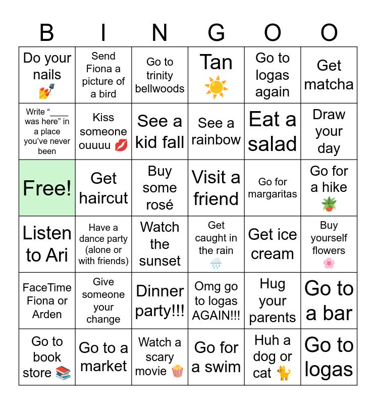 This bingo card has 36 words: Omg go to logas AGAIN!!!, Dinner party!!!, Go for a swim, Write “____ was here” in a place you’ve never been, Listen to Ari, Visit a friend, Kiss someone ouuuu 💋, Watch a scary movie 🍿, Go to logas again, Hug your parents, Draw your day, Tan ☀️, Go to a bar, Get haircut, See a rainbow, Do your nails 💅, FaceTime Fiona or Arden, Go for margaritas, Free!, Go to trinity bellwoods, Buy some rosé, Have a dance party (alone or with friends), Get caught in the rain 🌧️, Watch the sunset, Get ice cream, Send Fiona a picture of a bird, Eat a salad, Go to a market, See a kid fall, Get matcha, Go to logas, Go to book store 📚, Buy yourself flowers 🌸, Go for a hike 🪴, Give someone your change and Huh a dog or cat 🐈.