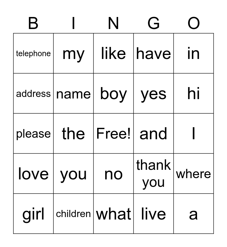 This bingo card has a free space and 24 words: you, children, boy, girl, in, telephone, address, my, and, no, yes, please, thank you, where, name, live, I, like, hi, the, a, love, have and what.