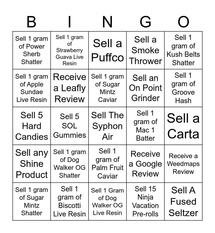 This bingo card has a free space and 24 words: Sell 1 gram of Dog Walker OG Shatter, Sell 1 gram of Biscotti Live Resin, Sell 1 gram of Sugar Mintz Caviar, Sell 1 gram of Sugar Mintz Shatter, Sell 1 gram of Kush Belts Shatter, Sell 1 gram of Power Sherb Shatter, Sell 1 gram of Apple Sundae Live Resin, Sell 1 gram of Strawberry Guava Live Resin, Sell 1 gram of Mac 1 Batter, Sell 1 gram of Palm Fruit Caviar, Sell an On Point Grinder, Sell 5 Hard Candies, Receive a Google Review, Receive a Weedmaps Review, Receive a Leafly Review, Sell 15 Ninja Vacation Pre-rolls, Sell a Carta, Sell a Puffco, Sell 1 gram of Groove Hash, Sell 5 SOL Gummies, Sell A Fused Seltzer, Sell any Shine Product, Sell a Smoke Thrower and Sell 1 Gram of Dog Walker OG Live Resin.
