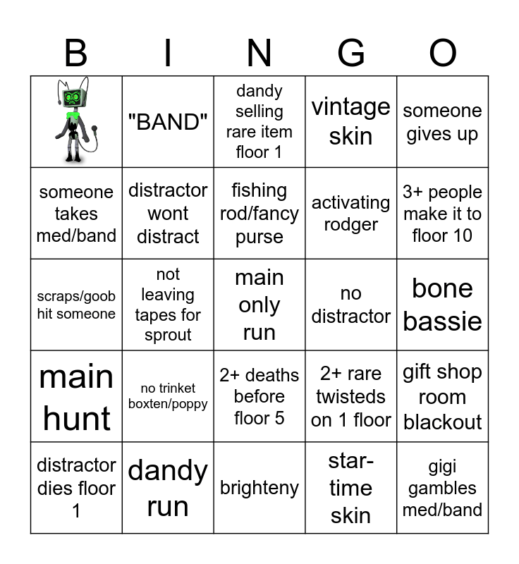 This bingo card has 1 images and 24 words: no trinket boxten/poppy, brighteny, fishing rod/fancy purse, distractor dies floor 1, someone gives up, someone takes med/band, "BAND", no distractor, 2+ deaths before floor 5, activating rodger, scraps/goob hit someone, 2+ rare twisteds on 1 floor, gift shop room blackout, distractor wont distract, gigi gambles med/band, bone bassie, dandy selling rare item floor 1, 3+ people make it to floor 10, not leaving tapes for sprout, main only run, dandy run, main hunt, vintage skin and star-time skin.