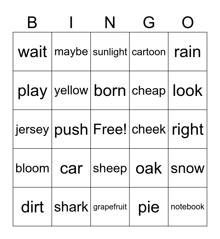 This bingo card has a free space and 24 words: car, shark, born, dirt, rain, wait, play, maybe, cheek, sheep, cheap, jersey, oak, snow, yellow, pie, right, sunlight, look, push, notebook, bloom, cartoon and grapefruit.