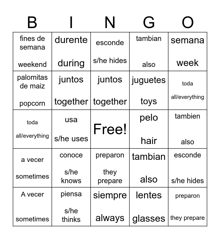 This bingo card has a free space and 24 words: conoce s/he knows, piensa s/he thinks, juntos together, A vecer sometimes, semana week, fines de semana weekend, palomitas de maiz popcorn, durente during, pelo hair, preparon they prepare, juguetes toys, toda all/everything, tambian also, esconde s/he hides, juntos together, lentes glasses, tambien also, esconde s/he hides, toda all/everything, usa s/he uses, preparon they prepare, a vecer sometimes, tambian also and siempre always.