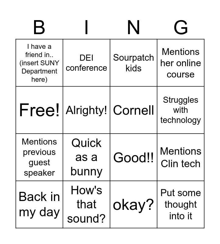 This bingo card has 16 words: How's that sound?, Mentions Clin tech, Sourpatch kids, I have a friend in.. (insert SUNY Department here), Mentions previous guest speaker, DEI conference, Good!!, okay?, Free!, Alrighty!, Back in my day, Mentions her online course, Quick as a bunny, Struggles with technology, Cornell and Put some thought into it.