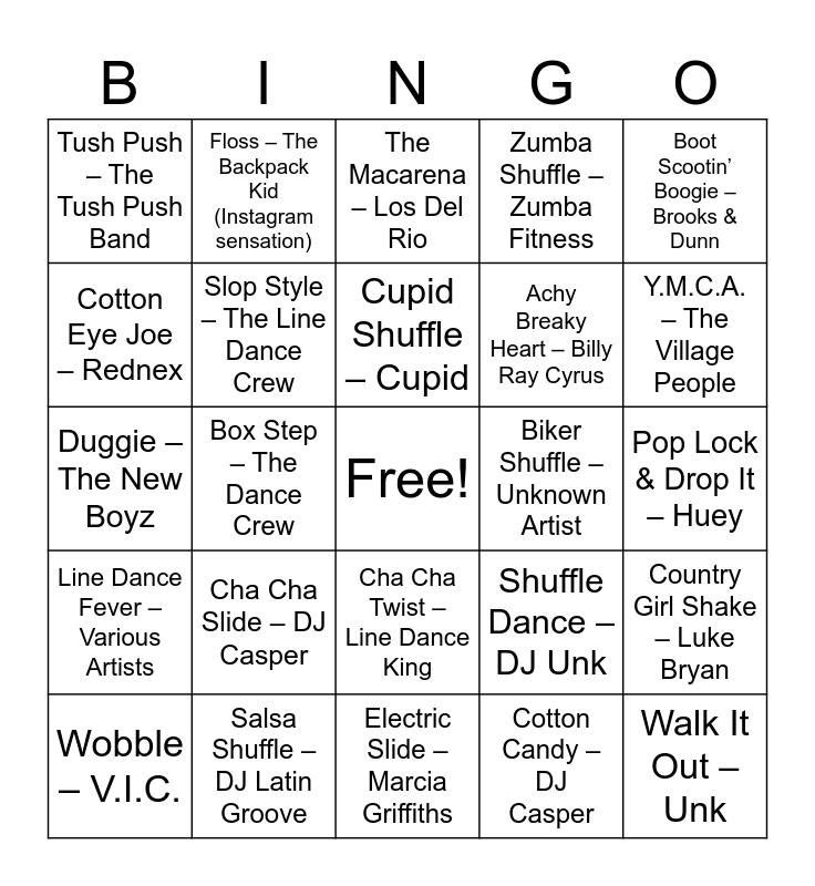This bingo card has a free space and 25 words: Cha Cha Slide – DJ Casper, Electric Slide – Marcia Griffiths, Cupid Shuffle – Cupid, Wobble – V.I.C., Boot Scootin’ Boogie – Brooks & Dunn, Tush Push – The Tush Push Band, Cotton Eye Joe – Rednex, Floss – The Backpack Kid (Instagram sensation), Biker Shuffle – Unknown Artist, Cha Cha Twist – Line Dance King, Achy Breaky Heart – Billy Ray Cyrus, Duggie – The New Boyz, Shuffle Dance – DJ Unk, Country Girl Shake – Luke Bryan, Slop Style – The Line Dance Crew, Cabbage Patch – The Cabbage Patch Dancers, Pop Lock & Drop It – Huey, The Macarena – Los Del Rio, Y.M.C.A. – The Village People, Box Step – The Dance Crew, Walk It Out – Unk, Salsa Shuffle – DJ Latin Groove, Line Dance Fever – Various Artists, Zumba Shuffle – Zumba Fitness and Cotton Candy – DJ Casper.