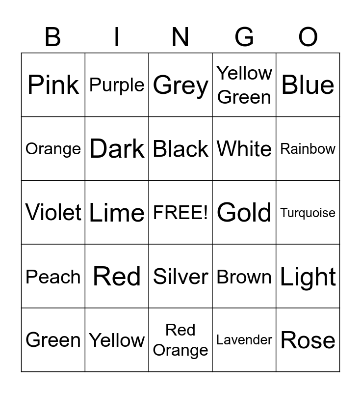 This bingo card has a free space and 24 words: Red, Yellow, Black, Green, Blue, Pink, Orange, Purple, Gold, Silver, White, Violet, Brown, Light, Dark, Lavender, Turquoise, Grey, Rainbow, Lime, Rose, Peach, Yellow Green and Red Orange.