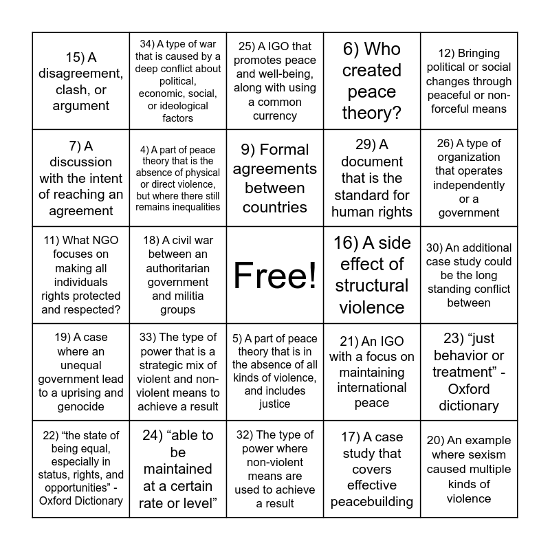 This bingo card has a free space and 35 words: 1) What type of violence includes the following: War, Terrorism, Torture, and Murder, 2) What type of violence includes the following: law’s or structures that oppress or underserve a group of people, 3) What type of violence includes using an aspect of culture used to justify another means of violence, 4) A part of peace theory that is the absence of physical or direct violence, but where there still remains inequalities, 5) A part of peace theory that is in the absence of all kinds of violence, and includes justice, 6) Who created peace theory?, 7) A discussion with the intent of reaching an agreement, 8) The use of violence or intimidation in pursuit of political aims, 9) Formal agreements between countries, 10) A conflict between two or more states, 11) What NGO focuses on making all individuals rights protected and respected?, 12) Bringing political or social changes through peaceful or non-forceful means, 13) “behavior involving physical force intended to hurt, damage, or kill someone or something.” - Oxford dictionary, 14) “freedom from disturbance; tranquility” - Oxford dictionary, 15) A disagreement, clash, or argument, 16) A side effect of structural violence, 17) A case study that covers effective peacebuilding, 18) A civil war between an authoritarian government and militia groups, 19) A case where an unequal government lead to a uprising and genocide, 20) An example where sexism caused multiple kinds of violence, 21) An IGO with a focus on maintaining international peace, 22) “the state of being equal, especially in status, rights, and opportunities” - Oxford Dictionary, 23) “just behavior or treatment” - Oxford dictionary, 24) “able to be maintained at a certain rate or level”, 25) A IGO that promotes peace and well-being, along with using a common currency, 26) A type of organization that operates independently or a government, 27) A type of organization that is between multiple states or governments, 28) A company that operates in multiple countries, 29) A document that is the standard for human rights, 30) An additional case study could be the long standing conflict between, 31) The type of power that can involve violence as the method in which they achieve a result, 32) The type of power where non-violent means are used to achieve a result, 33) The type of power that is a strategic mix of violent and non-violent means to achieve a result, 34) A type of war that is caused by a deep conflict about political, economic, social, or ideological factors and 35) The type of human rights that free you from interference or violence.