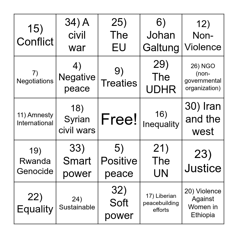 This bingo card has a free space and 35 words: 1) Direct, 2) Structural, 3) Cultural, 4) Negative peace, 5) Positive peace, 6) Johan Galtung, 7) Negotiations, 8) Terrorism, 9) Treaties, 10) Interstate violence, 11) Amnesty International, 12) Non-Violence, 13) Violence, 14) Peace, 15) Conflict, 16) Inequality, 17) Liberian peacebuilding efforts, 18) Syrian civil wars, 19) Rwanda Genocide, 20) Violence Against Women in Ethiopia, 21) The UN, 22) Equality, 23) Justice, 24) Sustainable, 25) The EU, 26) NGO (non-governmental organization), 27) IGO (intergovernmental organization), 28) MNC (multi national corporation), 29) The UDHR, 30) Iran and the west, 31) Hard power, 32) Soft power, 33) Smart power, 34) A civil war and 35) Negative rights.