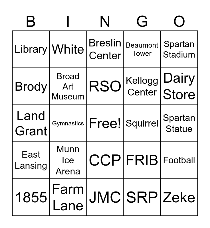 This bingo card has a free space and 43 words: Red Cedar, Zeke, Green, 1855, Grand River, SRP, Breslin Center, M.A.C., Spartan Stadium, Farm Lane, Beaumont Tower, Squirrel, CCP, Munn Ice Arena, IR, JMC, PTCD, Land Grant, Student Senate, Dairy Store, White, Case Hall, Sparty, Library, Beal Botanical Garden, Spartan Statue, State Agricultural College, Spartans, FRIB, East Lansing, Abrams Planetarium, Football, Hockey, Gymnastics, Textbook, Career, Internship, RSO, Brody, Kellogg Center, Auditorium, Broad Art Museum and MSU Museum.