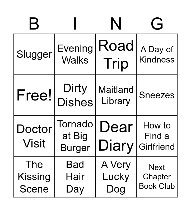 This bingo card has 16 words: Bad Hair Day, How to Find a Girlfriend, Road Trip, Slugger, Doctor Visit, Evening Walks, Dear Diary, A Very Lucky Dog, Free!, Dirty Dishes, The Kissing Scene, A Day of Kindness, Tornado at Big Burger, Sneezes, Maitland Library and Next Chapter Book Club.