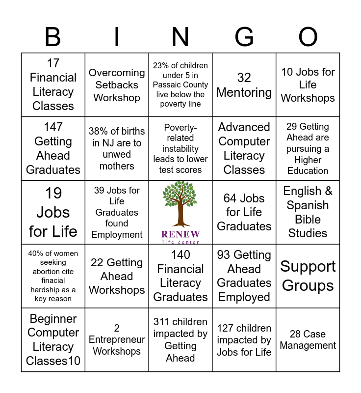 This bingo card has a free space and 24 words: 22 Getting Ahead Workshops, 2 Entrepreneur Workshops, Poverty-related instability leads to lower test scores, Beginner Computer Literacy Classes10, 10 Jobs for Life Workshops, 17 Financial Literacy Classes, 147 Getting Ahead Graduates, Overcoming Setbacks Workshop, 64 Jobs for Life Graduates, 140 Financial Literacy Graduates, Advanced Computer Literacy Classes, 19 Jobs for Life, 93 Getting Ahead Graduates Employed, Support Groups, 38% of births in NJ are to unwed mothers, 127 children impacted by Jobs for Life, English & Spanish Bible Studies, 23% of children under 5 in Passaic County live below the poverty line, 29 Getting Ahead are pursuing a Higher Education, 39 Jobs for Life Graduates found Employment, 28 Case Management, 40% of women seeking abortion cite finacial hardship as a key reason, 32 Mentoring and 311 children impacted by Getting Ahead.