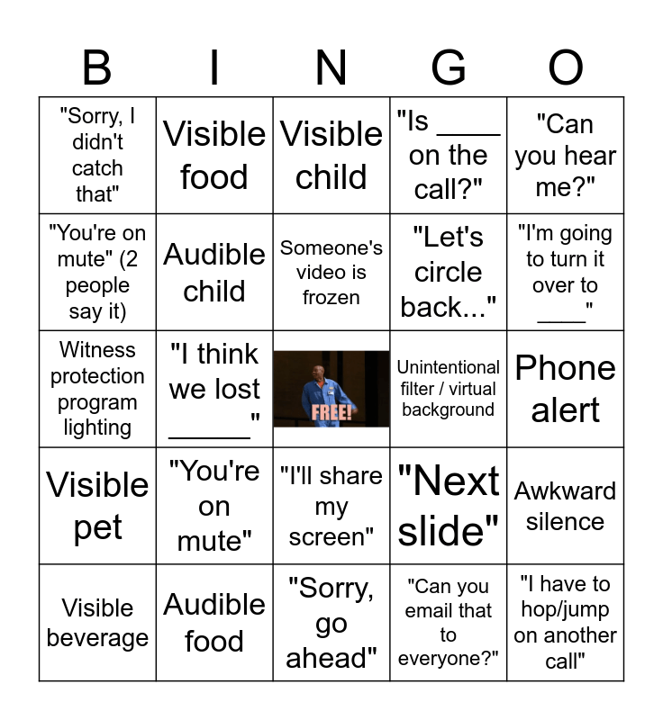 This bingo card has a free space and 24 words: "You're on mute", Audible food, Someone's video is frozen, Visible beverage, "Can you hear me?", "Sorry, I didn't catch that", "You're on mute" (2 people say it), Visible food, Unintentional filter / virtual background, "I'll share my screen", "Let's circle back...", Witness protection program lighting, "Next slide", Awkward silence, Audible child, "Can you email that to everyone?", Phone alert, Visible child, "I'm going to turn it over to ____", "I think we lost _____", "I have to hop/jump on another call", Visible pet, "Is ____ on the call?" and "Sorry, go ahead".