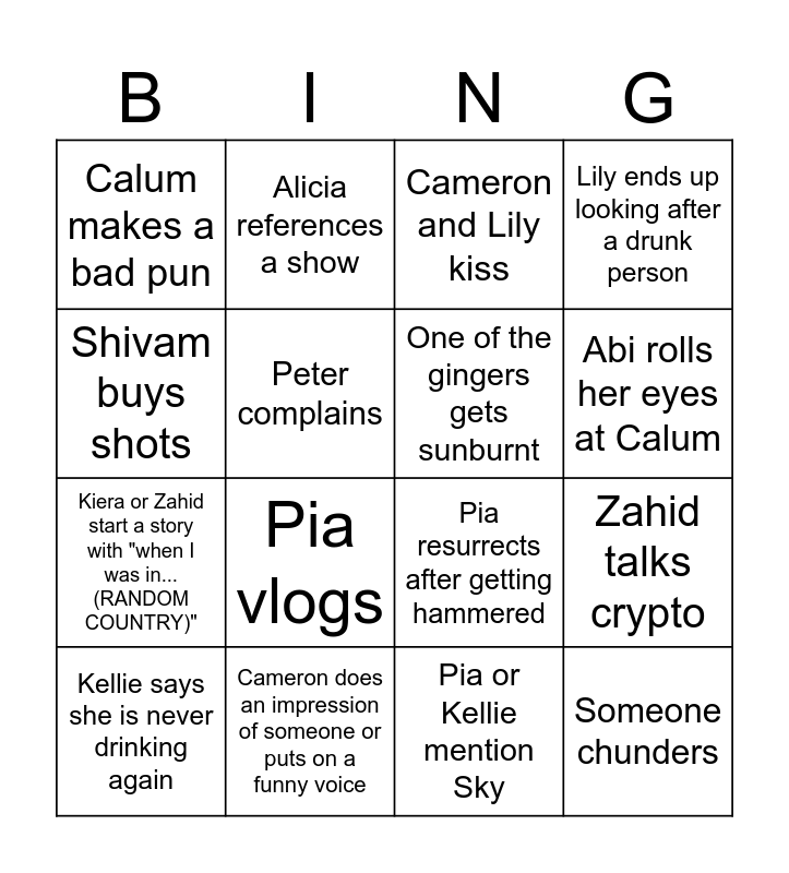 This bingo card has 18 words: Pia vlogs, Someone chunders, Cameron and Lily kiss, Calum makes a bad pun, Pia resurrects after getting hammered, Lily ends up looking after a drunk person, Kellie says she is never drinking again, Alicia references a show, Abi rolls her eyes at Calum, Kiera or Zahid start a story with "when I was in... (RANDOM COUNTRY)", Pia or Kellie mention Sky, Shivam buys shots, Zahid talks crypto, Peter complains, One of the gingers gets sunburnt, Someone cries, Cameron does an impression of someone or puts on a funny voice and Alicia bursts into song.