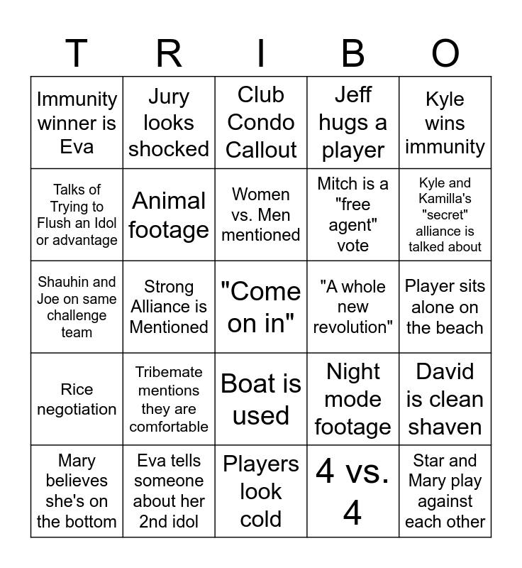 This bingo card has a free space and 29 words: Mary believes she's on the bottom, Someone goes on Journey, Strong Alliance is Mentioned, Buff worn as bandana, Immunity winner is Eva, Club Condo Callout, Animal footage, Tribemate mentions they are comfortable, "A whole new revolution", Eva tells someone about her 2nd idol, Player sits alone on the beach, Star and Mary play against each other, Players look cold, 4 vs. 4, Kyle and Kamilla's "secret" alliance is talked about, Immunity idol played, Boat is used, Rice negotiation, Kyle wins immunity, Shauhin and Joe on same challenge team, Night mode footage, Ocean challenge, Mitch is a "free agent" vote, Talks of Trying to Flush an Idol or advantage, Jeff hugs a player, Jury looks shocked, David is clean shaven, Women vs. Men mentioned and Voted-off player hugs tribe.