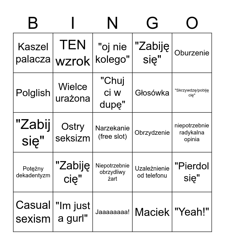 This bingo card has a free space and 24 words: Casual sexism, "Zabiję cię", "Chuj ci w dupę", Maciek, Oburzenie, Kaszel palacza, TEN wzrok, "oj nie kolego", Obrzydzenie, niepotrzebnie radykalna opinia, "Zabij się", Wielce urażona, Uzależnienie od telefonu, "Pierdol się", Polglish, "Im just a gurl", Jaaaaaaaa!, "Zabiję się", "Skrzywdzę/pobiję cię", Potężny dekadentyzm, Ostry seksizm, Niepotrzebnie obrzydliwy żart, Głosówka and "Yeah!".