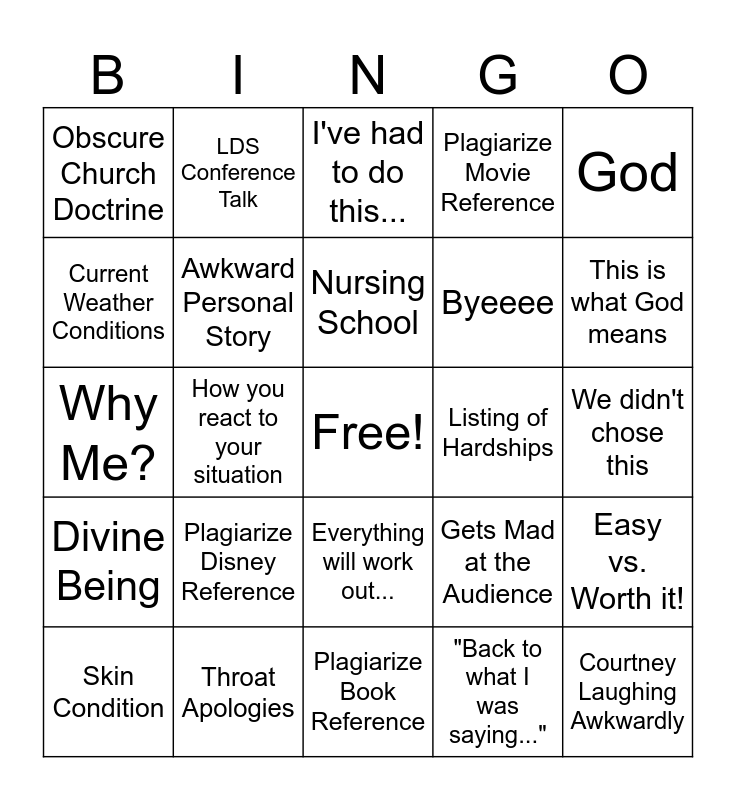 This bingo card has a free space and 24 words: Plagiarize Disney Reference, Throat Apologies, Nursing School, Skin Condition, God, Obscure Church Doctrine, Current Weather Conditions, LDS Conference Talk, Listing of Hardships, Everything will work out..., Byeeee, Why Me?, Gets Mad at the Audience, Easy vs. Worth it!, Awkward Personal Story, "Back to what I was saying...", We didn't chose this, I've had to do this..., This is what God means, How you react to your situation, Courtney Laughing Awkwardly, Divine Being, Plagiarize Movie Reference and Plagiarize Book Reference.