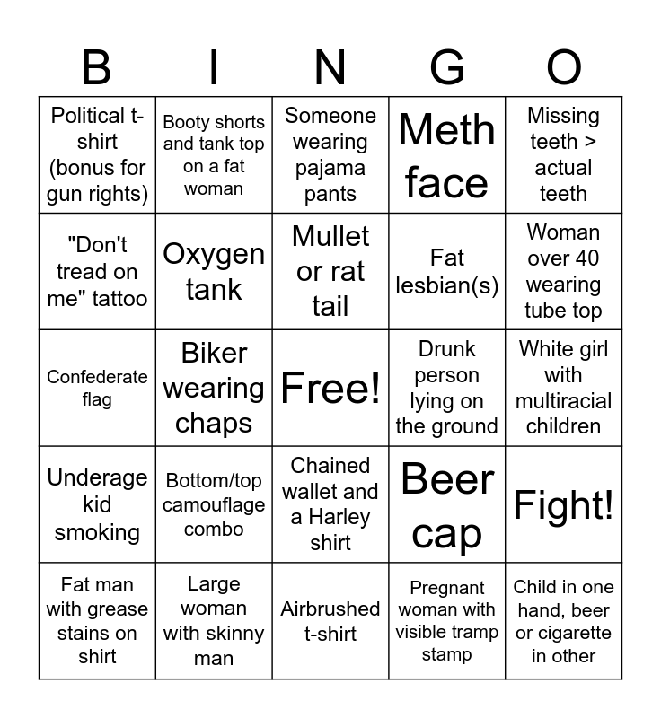 This bingo card has a free space and 24 words: Bottom/top camouflage combo, Large woman with skinny man, Mullet or rat tail, Fat man with grease stains on shirt, Missing teeth > actual teeth, Political t-shirt (bonus for gun rights), "Don't tread on me" tattoo, Booty shorts and tank top on a fat woman, Drunk person lying on the ground, Chained wallet and a Harley shirt, Fat lesbian(s), Confederate flag, Beer cap, Fight!, Oxygen tank, Pregnant woman with visible tramp stamp, White girl with multiracial children, Someone wearing pajama pants, Woman over 40 wearing tube top, Biker wearing chaps, Child in one hand, beer or cigarette in other, Underage kid smoking, Meth face and Airbrushed t-shirt.