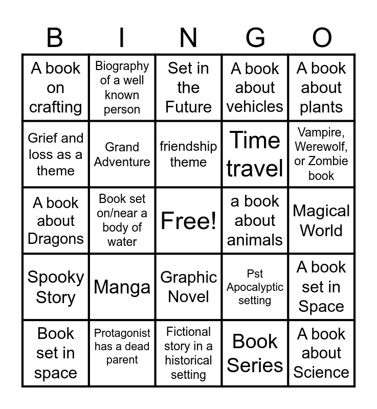 This bingo card has a free space and 24 words: Manga, Protagonist has a dead parent, friendship theme, Book set in space, A book about plants, A book on crafting, Grief and loss as a theme, Biography of a well known person, a book about animals, Graphic Novel, Time travel, A book about Dragons, Pst Apocalyptic setting, A book set in Space, Grand Adventure, Book Series, Magical World, Set in the Future, Vampire, Werewolf, or Zombie book, Book set on/near a body of water, A book about Science, Spooky Story, A book about vehicles and Fictional story in a historical setting.