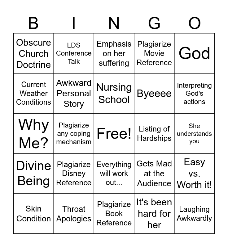 This bingo card has a free space and 24 words: Plagiarize Disney Reference, Throat Apologies, Nursing School, Skin Condition, God, Obscure Church Doctrine, Current Weather Conditions, LDS Conference Talk, Listing of Hardships, Everything will work out..., Byeeee, Why Me?, Gets Mad at the Audience, Easy vs. Worth it!, Awkward Personal Story, It's been hard for her, She understands you, Emphasis on her suffering, Interpreting God's actions, Plagiarize any coping mechanism, Laughing Awkwardly, Divine Being, Plagiarize Movie Reference and Plagiarize Book Reference.