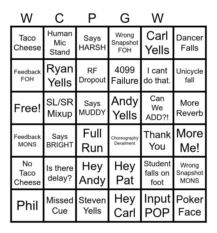 This bingo card has 36 words: Hey Pat, Hey Andy, Hey Carl, Feedback FOH, Feedback MONS, Andy Yells, Ryan Yells, Steven Yells, Carl Yells, Student falls on foot, Unicycle fall, Wrong Snapshot FOH, Wrong Snapshot MONS, SL/SR Mixup, 4099 Failure, Taco Cheese, No Taco Cheese, Can We ADD?!, Free!, Says HARSH, Says MUDDY, Says BRIGHT, Choreography Derailment, Full Run, Thank You, Human Mic Stand, I cant do that., Missed Cue, RF Dropout, Dancer Falls, Poker Face, Phil, More Me!, More Reverb, Is there delay? and Input POP.