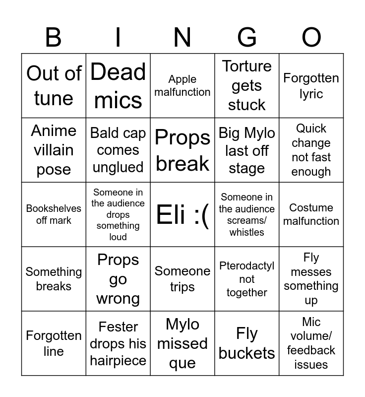 This bingo card has a free space and 24 words: Props go wrong, Fester drops his hairpiece, Props break, Forgotten line, Forgotten lyric, Out of tune, Anime villain pose, Dead mics, Someone in the audience screams/ whistles, Someone trips, Big Mylo last off stage, Bookshelves off mark, Pterodactyl not together, Fly messes something up, Bald cap comes unglued, Fly buckets, Costume malfunction, Apple malfunction, Quick change not fast enough, Someone in the audience drops something loud, Mic volume/ feedback issues, Something breaks, Torture gets stuck and Mylo missed que.