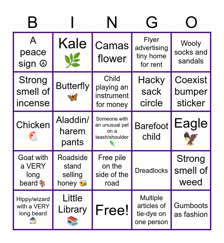 This bingo card has 25 words: Goat with a VERY long beard🐐, Little Library 📚, Someone with an unusual pet on a leash/shoulder🦎, Multiple articles of tie-dye on one person, Wooly socks and sandals, A peace sign ☮, Kale 🌿, Camas flower, Barefoot child, Strong smell of weed, Strong smell of incense, Butterfly🦋, Free!, Dreadlocks, Coexist bumper sticker, Hippy/wizard with a VERY long beard🧙♂️, Aladdin/ harem pants, Child playing an instrument for money, Hacky sack circle, Eagle🦅, Chicken🐔, Roadside stand selling honey 🐝, Free pile on the side of the road, Flyer advertising tiny home for rent and Gumboots as fashion.