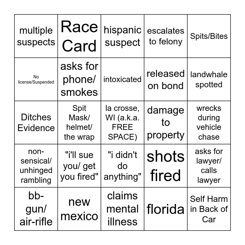 This bingo card has a free space and 76 words: foot-bail, white suspect, hispanic suspect, black suspect, on probation/ repeat offender, "I Know My Rights", "i'm not resisting", Fleeing using vehicle, suspect Pepper Sprayed/ tased, suspect shot, drugs/ paraphernalia, screaming/ crying, intoxicated, No license/Suspended, "I Can't Breathe", Spit Mask/ helmet/ the wrap, crackhead, Self Harm in Back of Car, Threatens Violence, Spits/Bites, entitlement, Ditches Evidence, asks for phone/ smokes, Race Card, escalates to felony, "i got kids!", suspect being rude, Claims physical injury, "The Cuffs Are Too Tight", Pit/Spike, K-9 Deployment, hit and run, cop closes door mid sentence, shots fired, landwhale spotted, released on bond, demands supervisor, obstructing/ resisting, wrecks during vehicle chase, florida, obnoxious bystander, No license/Suspended, active warrant, robbery/ theft, stolen vehicle, suspect pulls weapon, bb-gun/ air-rifle, multiple suspects, cop interrupted during miranda reading, sedative administered, wisconsin, "i didn't do anything", ems called, "i got nothing on me", ignoring lawful commands, painfully obvious lie(s), "i was scared", traffic stop, suspect being overly nice, asks for name/ badge, "i'll sue you/ get you fired", karen, comically black name, "why?"/ "for what?", battery to an officer, innocents injured, damage to property, S.A. Card, slips cuffs/ goes nuts in back of squad, cussing out cops, asks for lawyer/ calls lawyer, non-sensical/ unhinged rambling, new mexico, suspect *decentralized*, claims mental illness and misuse of 911.