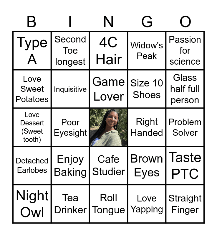 This bingo card has a free space and 27 words: Brown Eyes, Brown Hair, Size 10 Shoes, Roll Tongue, Love Sweet Potatoes, 4C Hair, Second Toe longest, Detached Earlobes, Right Handed, Taste PTC, Love Dessert (Sweet tooth), Widow's Peak, Night Owl, Tea Drinker, Glass half full person, Extrovert, Inquisitive, Game Lover, Enjoy Baking, Type A, Problem Solver, Love Yapping, Poor Eyesight, Straight Finger, Cafe Studier, Passion for science and Passion for History.