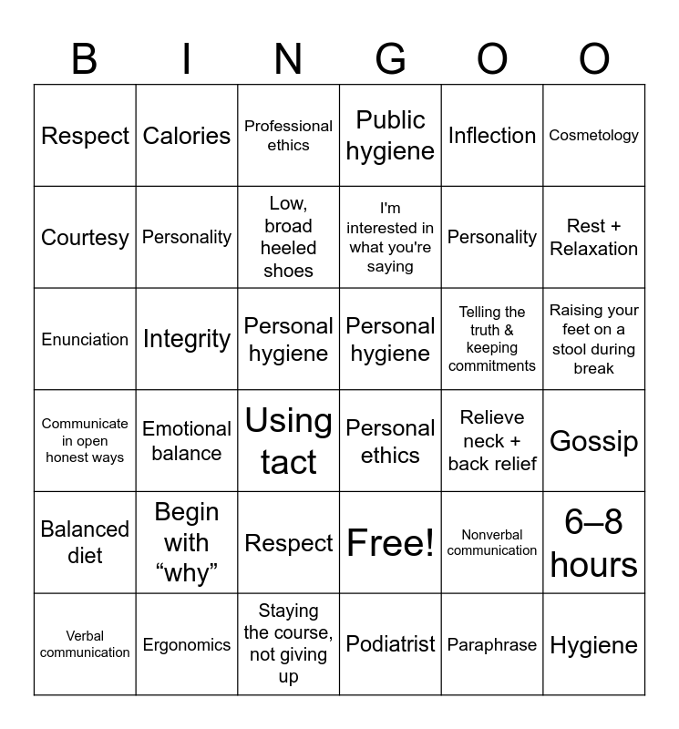 This bingo card has 36 words: Free!, Respect, Podiatrist, Courtesy, Communicate in open honest ways, Personal hygiene, Personality, Staying the course, not giving up, Inflection, Nonverbal communication, Rest + Relaxation, Public hygiene, 6–8 hours, Integrity, I'm interested in what you're saying, Respect, Balanced diet, Telling the truth & keeping commitments, Enunciation, Professional ethics, Personal hygiene, Emotional balance, Personal ethics, Using tact, Relieve neck + back relief, Calories, Personality, Ergonomics, Low, broad heeled shoes, Cosmetology, Hygiene, Verbal communication, Gossip, Raising your feet on a stool during break, Begin with “why” and Paraphrase.