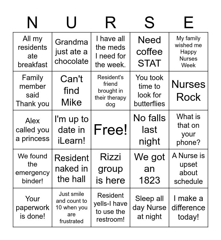 This bingo card has a free space and 25 words: Resident naked in the hall, Resident yells-I have to use the restroom!, Resident's friend brought in their therapy dog, Your paperwork is done!, My family wished me Happy Nurses Week, All my residents ate breakfast, Family member said Thank you, Grandma just ate a chocolate, No falls last night, Rizzi group is here, You took time to look for butterflies, Alex called you a princess, We got an 1823, A Nurse is upset about schedule, Can't find Mike, Someone said they love you today!, What is that on your phone?, I have all the meds I need for the week., Nurses Rock, I'm up to date in iLearn!, I make a difference today!, Just smile and count to 10 when you are frustrated, We found the emergency binder!, Need coffee STAT and Sleep all day Nurse at night.