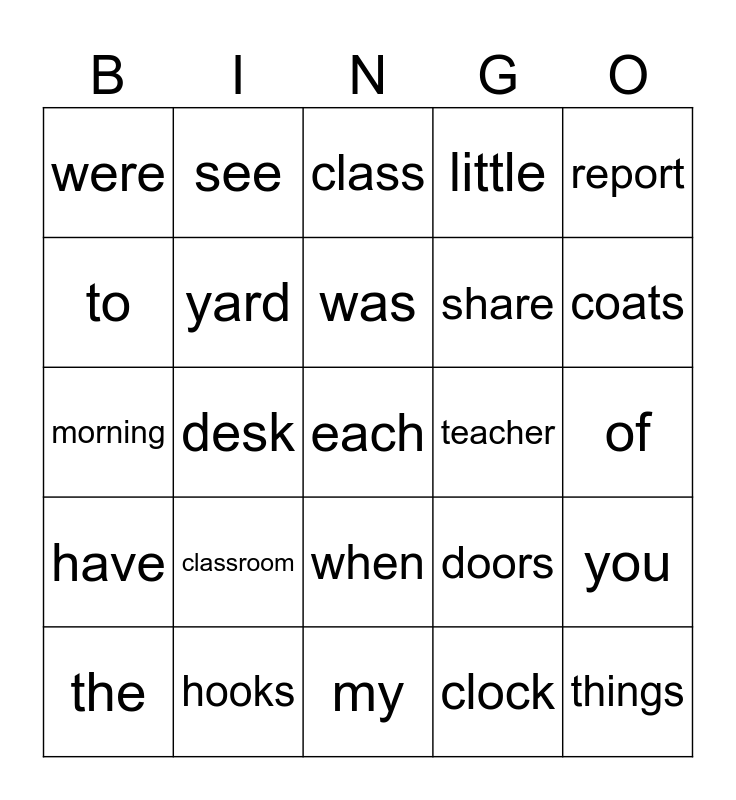 This bingo card has 30 words: hooks, with, desk, down, were, class, yard, when, teacher, my, of, each, clock, things, coats, has, doors, have, classroom, report, morning, nature, see, share, to, little, you, the, was and her.