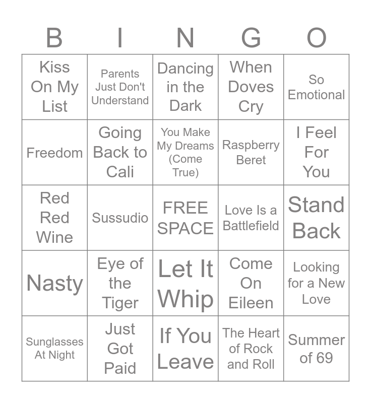 This bingo card has a free space and 75 words: Borderline, Let's Dance, Dancing in the Dark, Wanna Be Startin' Somethin', Little Red Corvette, Walking On Sunshine, Footloose, Sweet Dreams (Are Made of This), Caribbean Queen (No More Love On the Run), Jump (For My Love), Call Me, The Power of Love, You Make My Dreams (Come True), Freedom, Forget Me Nots, Sussudio, Flashdance... What a Feeling, Summer of 69, I'm Still Standing, So Emotional, Neutron Dance, Red Red Wine, Going Back to Cali, Parents Just Don't Understand, When Doves Cry, Rio, Do I Do, Beat It, Jessie's Girl, It Takes Two, When I Think of You, Cruel Summer, Faith, Come On Eileen, I Feel For You, Raspberry Beret, The Safety Dance, Higher Love, Stand Back, The Heart of Rock and Roll, We Got the Beat, Kiss, Freeway of Love, Don't You (Forget About Me), What Have You Done For Me Lately, Fight For Your Right, Sunglasses At Night, Kiss On My List, Don't You Want Me, I'll Tumble 4 Ya, Be Near Me, Let It Whip, Walk This Way, The Reflex, Take On Me, Oh Sheila, Venus, Forever Your Girl, Take Me Home, Don't Dream It's Over, Eye of the Tiger, Miami Vice Theme, Crush On You, Dancing In the Sheets, It's a Sin, Love Is a Battlefield, Nothin' But a Good Time, Sister Christian, Fame, Looking for a New Love, Nasty, Just Got Paid, I Think We're Alone Now, If You Leave and I Wanna Dance With Somebody.