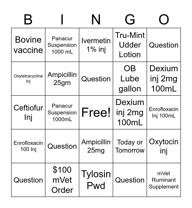 This bingo card has a free space and 24 words: Question, Question, Question, Question, Question, Bovine vaccine, Panacur Suspension 1000 mL, Ivermetin 1% inj, Dexium inj 2mg 100mL, Enrofloxacin Inj 100mL, Ceftiofur Inj, Ampicillin 25gm, Today or Tomorrow, Oxytocin inj, Oxytetracycline Inj, $100 mVet Order, Tylosin Pwd, Tru-Mint Udder Lotion, Dexium inj 2mg 100mL, Enrofloxacin 100 Inj, Panacur Suspension 1000mL, Ampicillin 25mg, OB Lube gallon and mVet Ruminant Supplement.
