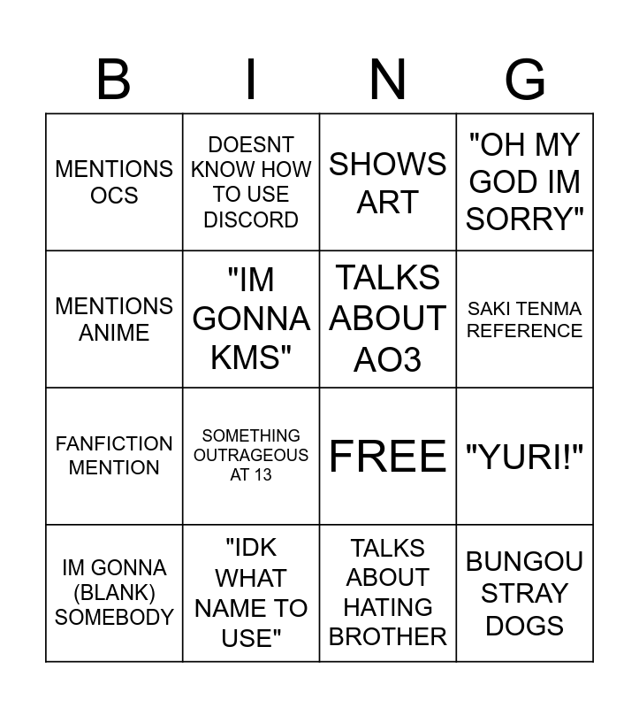 This bingo card has 16 words: "IDK WHAT NAME TO USE", "YURI!", SHOWS ART, MENTIONS OCS, FANFICTION MENTION, DOESNT KNOW HOW TO USE DISCORD, FREE, TALKS ABOUT HATING BROTHER, MENTIONS ANIME, "IM GONNA KMS", IM GONNA (BLANK) SOMEBODY, "OH MY GOD IM SORRY", SOMETHING OUTRAGEOUS AT 13, SAKI TENMA REFERENCE, TALKS ABOUT AO3 and BUNGOU STRAY DOGS.