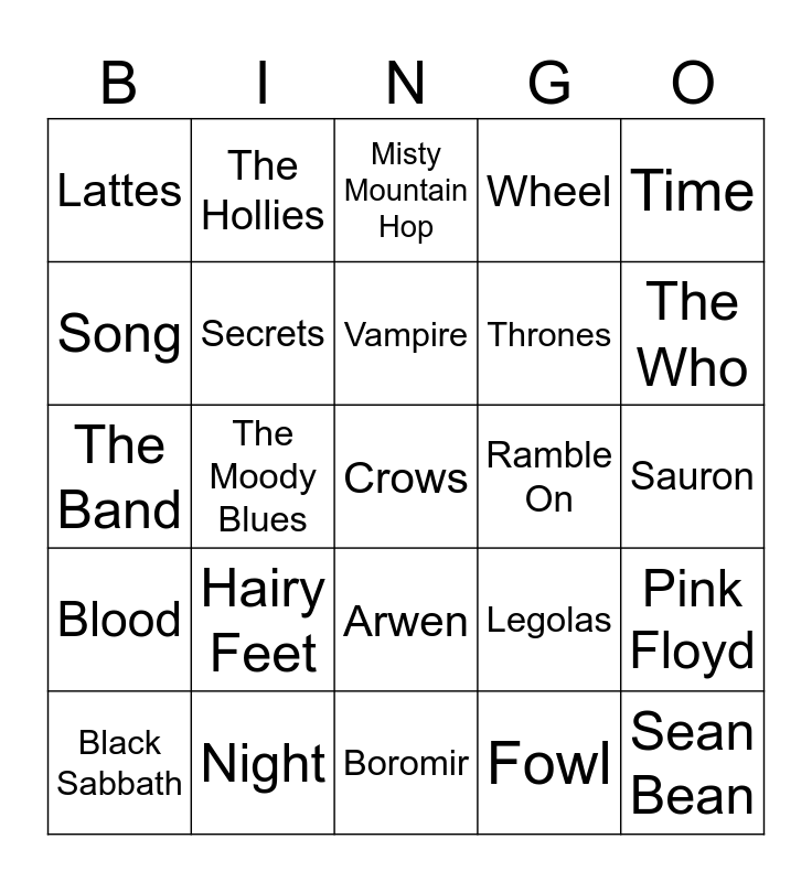 This bingo card has 60 words: Wind, Night, Poppy, Blood, Fowl, Prisoner, Secrets, Cerulean, Thrones, Storm, Wheel, Compass, Song, Court, Fourth, Lattes, Crows, Time, Chronicles, Vampire, Ramble On, Misty Mountain Hop, Black Sabbath, Pink Floyd, Rush, Yes, Allman Brothers Band, Santana, The Who, The Cars, Steely Dan, Buffalo Springfield, The Zombies, Bob Seger, The Hollies, Ten Years After, America, The Moody Blues, Tommy James & The Shondells, The Band, The Shire, Hairy Feet, Sauron, Saruman, Legolas, Gimli, Strider, Ents, Moria, Arwen, Boromir, Sting, Peter Jackson, Return of the King, Smeagol, Elijah Wood, Orlando Bloom, Viggo Morteson, Sean Bean and Nazgul.