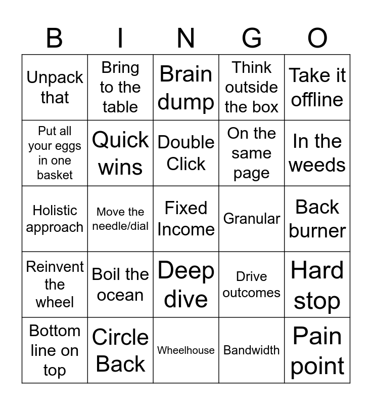 This bingo card has a free space and 24 words: Boil the ocean, Circle Back, Double Click, Bottom line on top, Take it offline, Unpack that, Put all your eggs in one basket, Bring to the table, Granular, Deep dive, On the same page, Holistic approach, Drive outcomes, Hard stop, Quick wins, Bandwidth, Back burner, Brain dump, In the weeds, Move the needle/dial, Pain point, Reinvent the wheel, Think outside the box and Wheelhouse.