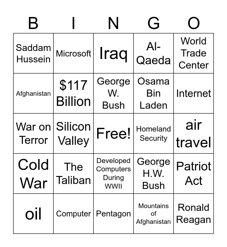 This bingo card has a free space and 24 words: The Taliban, Computer, George W. Bush, oil, World Trade Center, Saddam Hussein, Afghanistan, Microsoft, Homeland Security, Developed Computers During WWII, Osama Bin Laden, War on Terror, George H.W. Bush, Patriot Act, $117 Billion, Mountains of Afghanistan, air travel, Iraq, Internet, Silicon Valley, Ronald Reagan, Cold War, Al-Qaeda and Pentagon.