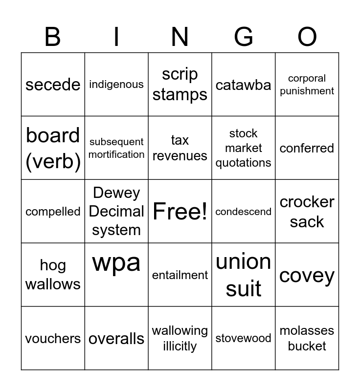 This bingo card has a free space and 24 words: wpa, overalls, tax revenues, vouchers, corporal punishment, secede, board (verb), indigenous, condescend, entailment, stock market quotations, compelled, union suit, covey, subsequent mortification, stovewood, crocker sack, scrip stamps, conferred, Dewey Decimal system, molasses bucket, hog wallows, catawba and wallowing illicitly.