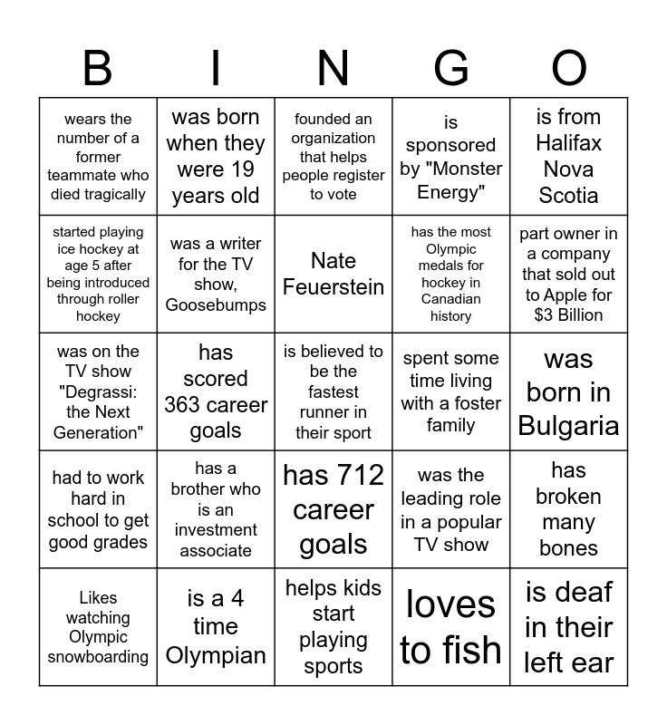 This bingo card has a free space and 29 words: Likes watching Olympic snowboarding, has parents who know their grammar rules, has scored 363 career goals, has a degree in medicine, wears the number of a former teammate who died tragically, founded an organization that helps people register to vote, was a writer for the TV show, Goosebumps, has a brother who is an investment associate, spent some time living with a foster family, is a 4 time Olympian, was born in Bulgaria, is deaf in their left ear, helps kids start playing sports, loves to fish, part owner in a company that sold out to Apple for $3 Billion, was raised in a Jewish household, has 712 career goals, had to work hard in school to get good grades, is from Halifax Nova Scotia, was on the TV show "Degrassi: the Next Generation", was the leading role in a popular TV show, was 19 when they led their country to victory, has the most Olympic medals for hockey in Canadian history, started playing ice hockey at age 5 after being introduced through roller hockey, is sponsored by "Monster Energy", was born when they were 19 years old, has broken many bones, Nate Feuerstein and is married to Bridgette Doremus.