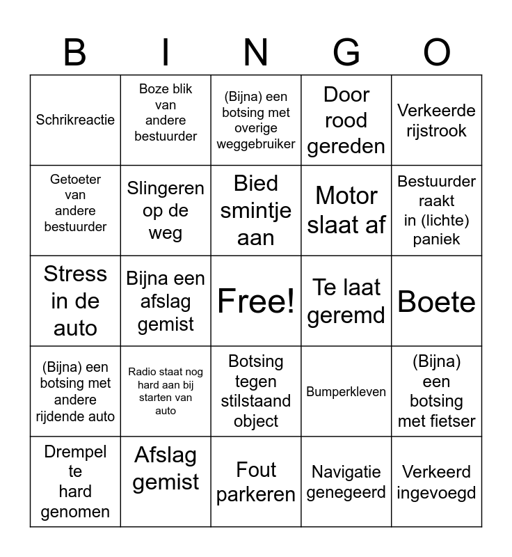 This bingo card has a free space and 24 words: Radio staat nog hard aan bij starten van auto, Afslag gemist, Bied smintje aan, Drempel te hard genomen, Verkeerde rijstrook, Schrikreactie, Getoeter van andere bestuurder, Boze blik van andere bestuurder, Te laat geremd, Botsing tegen stilstaand object, Motor slaat af, Stress in de auto, Bumperkleven, (Bijna) een botsing met fietser, Slingeren op de weg, Navigatie genegeerd, Boete, (Bijna) een botsing met overige weggebruiker, Bestuurder raakt in (lichte) paniek, Bijna een afslag gemist, Verkeerd ingevoegd, (Bijna) een botsing met andere rijdende auto, Door rood gereden and Fout parkeren.