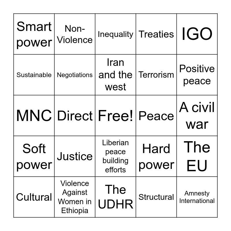 This bingo card has a free space and 35 words: Rwanda Genocide, Syrian civil wars, Equality, Negotiations, Liberian peace building efforts, Treaties, Sustainable, Negative peace, Iran and the west, Conflict, MNC, IGO, Negative rights, Violence, Smart power, Peace, Structural, Direct, Soft power, Amnesty International, Hard power, Cultural, The EU, Violence Against Women in Ethiopia, Inequality, Positive peace, Interstate violence, The UN, Terrorism, A civil war, NGO, The UDHR, Justice, Non-Violence and Johan Galtung.