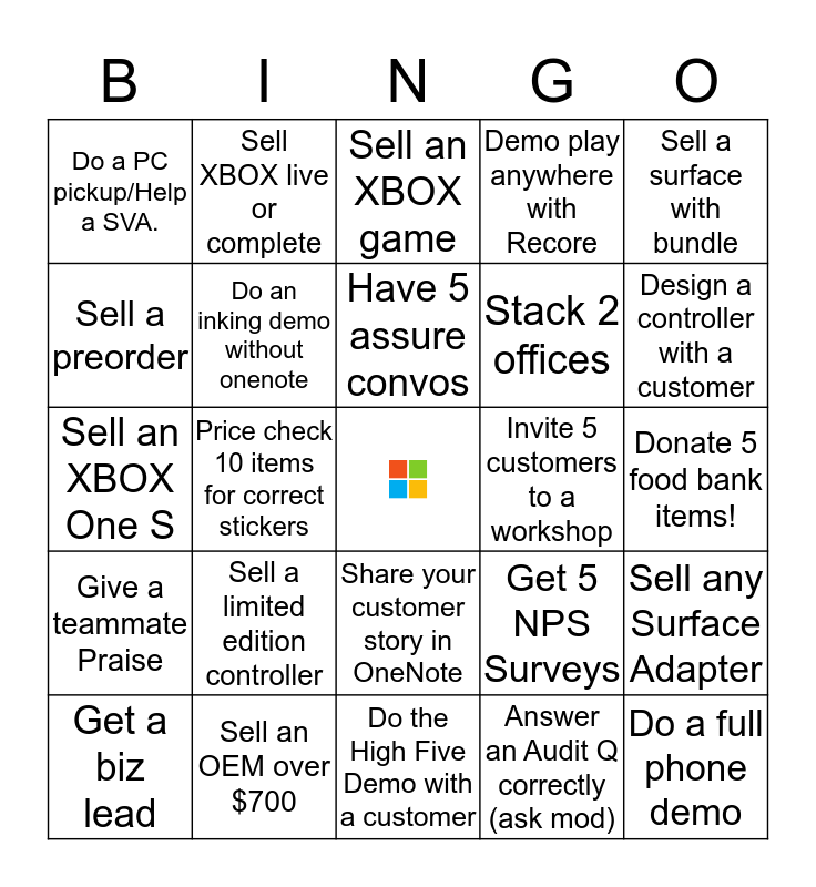 This bingo card has a free space and 24 words: Sell a limited edition controller, Sell an OEM over $700, Have 5 assure convos, Get a biz lead, Sell a surface with bundle, Do a PC pickup/Help a SVA., Sell a preorder, Sell XBOX live or complete, Invite 5 customers to a workshop, Share your customer story in OneNote, Stack 2 offices, Sell an XBOX One S, Get 5 NPS Surveys, Sell any Surface Adapter, Do an inking demo without onenote, Answer an Audit Q correctly (ask mod), Donate 5 food bank items!, Sell an XBOX game, Design a controller with a customer, Price check 10 items for correct stickers, Do a full phone demo, Give a teammate Praise, Demo play anywhere with Recore and Do the High Five Demo with a customer.