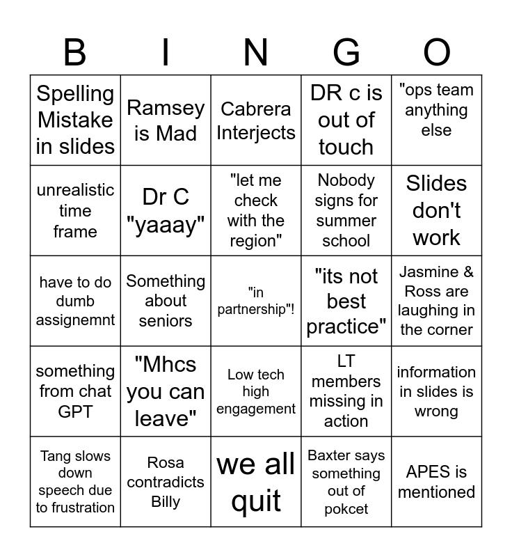 This bingo card has a free space and 24 words: "Mhcs you can leave", Rosa contradicts Billy, "let me check with the region", Tang slows down speech due to frustration, "ops team anything else, Spelling Mistake in slides, unrealistic time frame, Ramsey is Mad, "its not best practice", Low tech high engagement, Nobody signs for summer school, have to do dumb assignemnt, LT members missing in action, information in slides is wrong, Dr C "yaaay", Baxter says something out of pokcet, Jasmine & Ross are laughing in the corner, Cabrera Interjects, Slides don't work, Something about seniors, APES is mentioned, something from chat GPT, DR c is out of touch and we all quit.