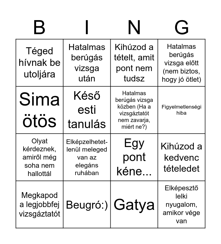 This bingo card has 16 words: Beugró:), Kihúzod a kedvenc tételedet, Kihúzod a tételt, amit pont nem tudsz, Téged hívnak be utoljára, Olyat kérdeznek, amiről még soha nem hallottál, Hatalmas berúgás vizsga után, Egy pont kéne..., Gatya, Sima ötös, Késő esti tanulás, Megkapod a legjobbfej vizsgáztatót, Hatalmas berúgás vizsga előtt (nem biztos, hogy jó ötlet), Elképzelhetet-lenül meleged van az elegáns ruhában, Figyelmetlenségi hiba, Hatalmas berúgás vizsga közben (Ha a vizsgáztatót nem zavarja, miért ne?) and Elképesztő lelki nyugalom, amikor vége van.