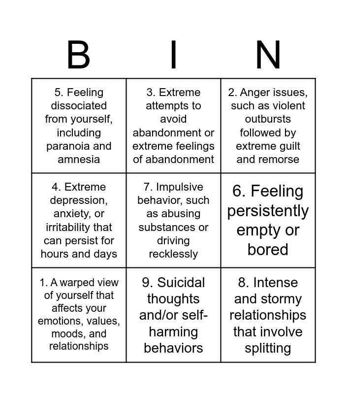 This bingo card has 9 words: 1. A warped view of yourself that affects your emotions, values, moods, and relationships, 2. Anger issues, such as violent outbursts followed by extreme guilt and remorse, 3. Extreme attempts to avoid abandonment or extreme feelings of abandonment, 4. Extreme depression, anxiety, or irritability that can persist for hours and days, 5. Feeling dissociated from yourself, including paranoia and amnesia, 6. Feeling persistently empty or bored, 7. Impulsive behavior, such as abusing substances or driving recklessly, 8. Intense and stormy relationships that involve splitting and 9. Suicidal thoughts and/or self-harming behaviors.