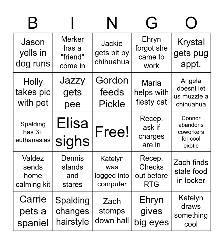 This bingo card has a free space and 24 words: Dennis stands and stares, Spalding changes hairstyle, Gordon feeds Pickle, Carrie pets a spaniel, Krystal gets pug appt., Jason yells in dog runs, Holly takes pic with pet, Merker has a "friend" come in, Recep. ask if charges are in, Katelyn was logged into computer, Maria helps with fiesty cat, Spalding has 3+ euthanasias, Recep. Checks out before RTG, Zach finds stale food in locker, Jazzy gets pee, Ehryn gives big eyes, Connor abandons coworkers for cool exotic, Jackie gets bit by chihuahua, Angela doesnt let us muzzle a chihuahua, Elisa sighs, Katelyn draws something cool, Valdez sends home calming kit, Ehryn forgot she came to work and Zach stomps down hall.